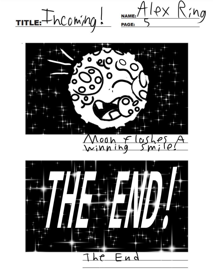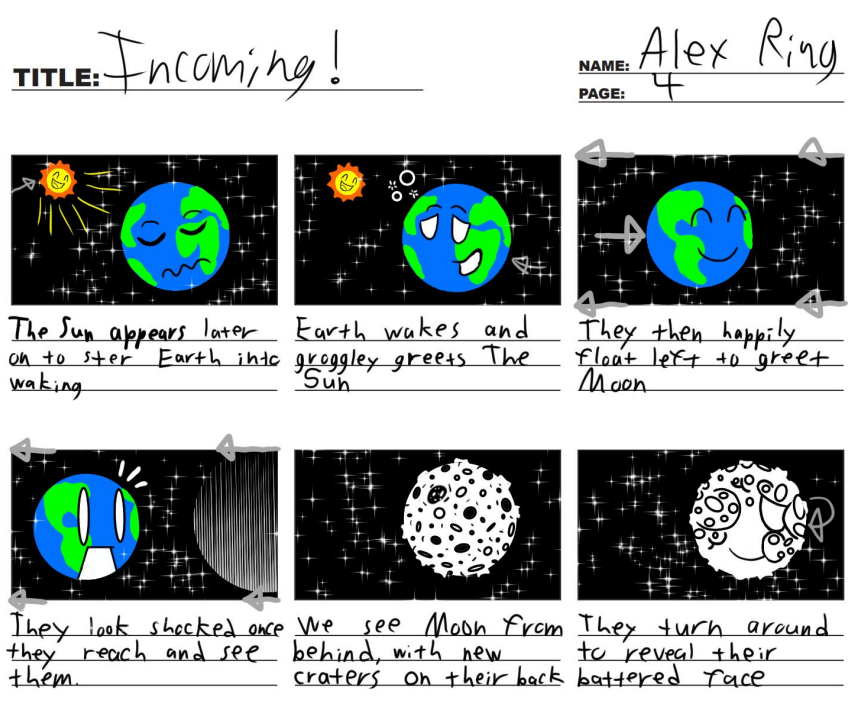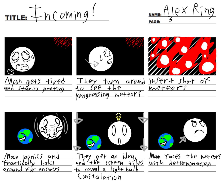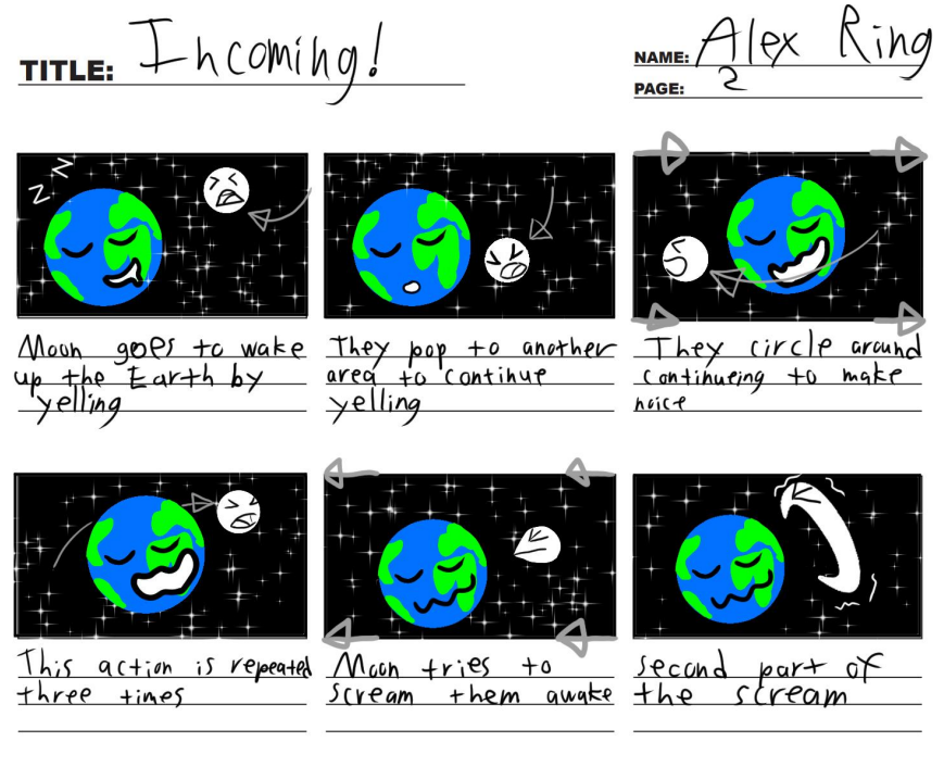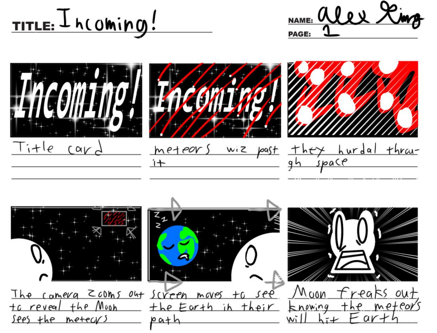 These are the story boards to my animated short INCOMING! which you can find on my YouTube channel here (https://www.youtube.com/watch?v=J6e8BISGVrY) along with many other of my written and directed videos. Of all my works however I feel this one best captures what I wish to create in my professional career, lively animations with a bit of bite and a lot of heart.